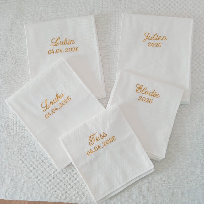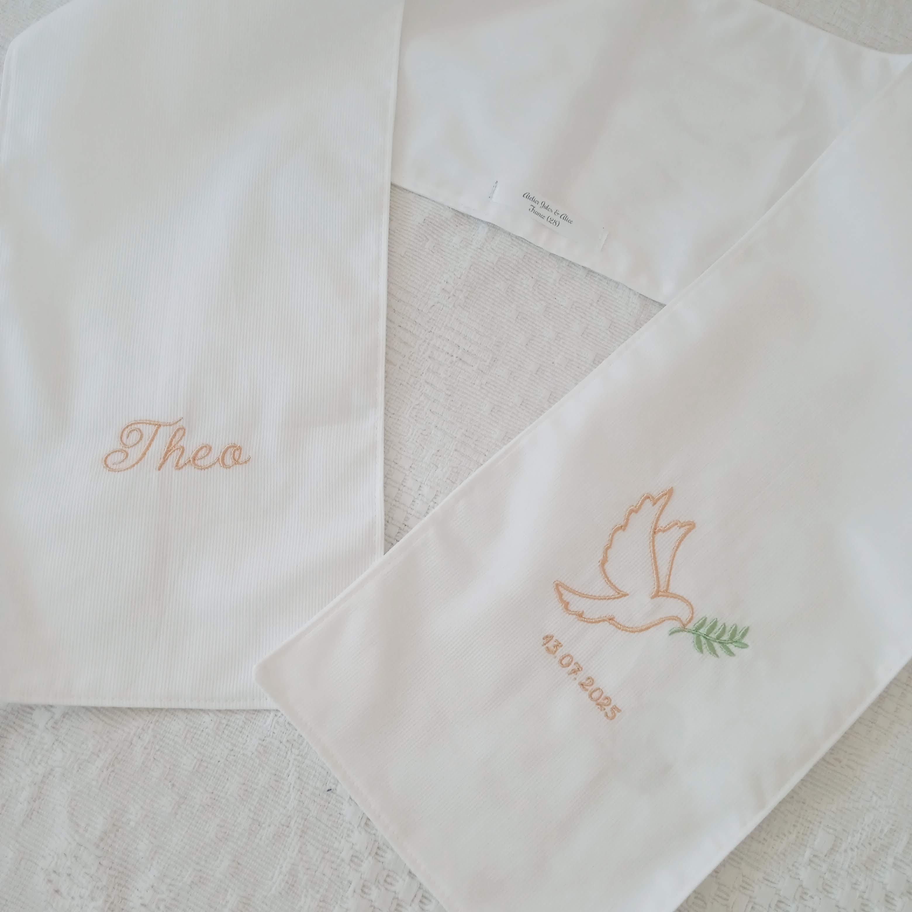 La broderie peut également être personnalisée avec le prénom de l’enfant et la date du baptême, pour transformer l’écharpe en un souvenir unique et profondément symbolique, que l’on conserve précieusement tout au long de la vie.