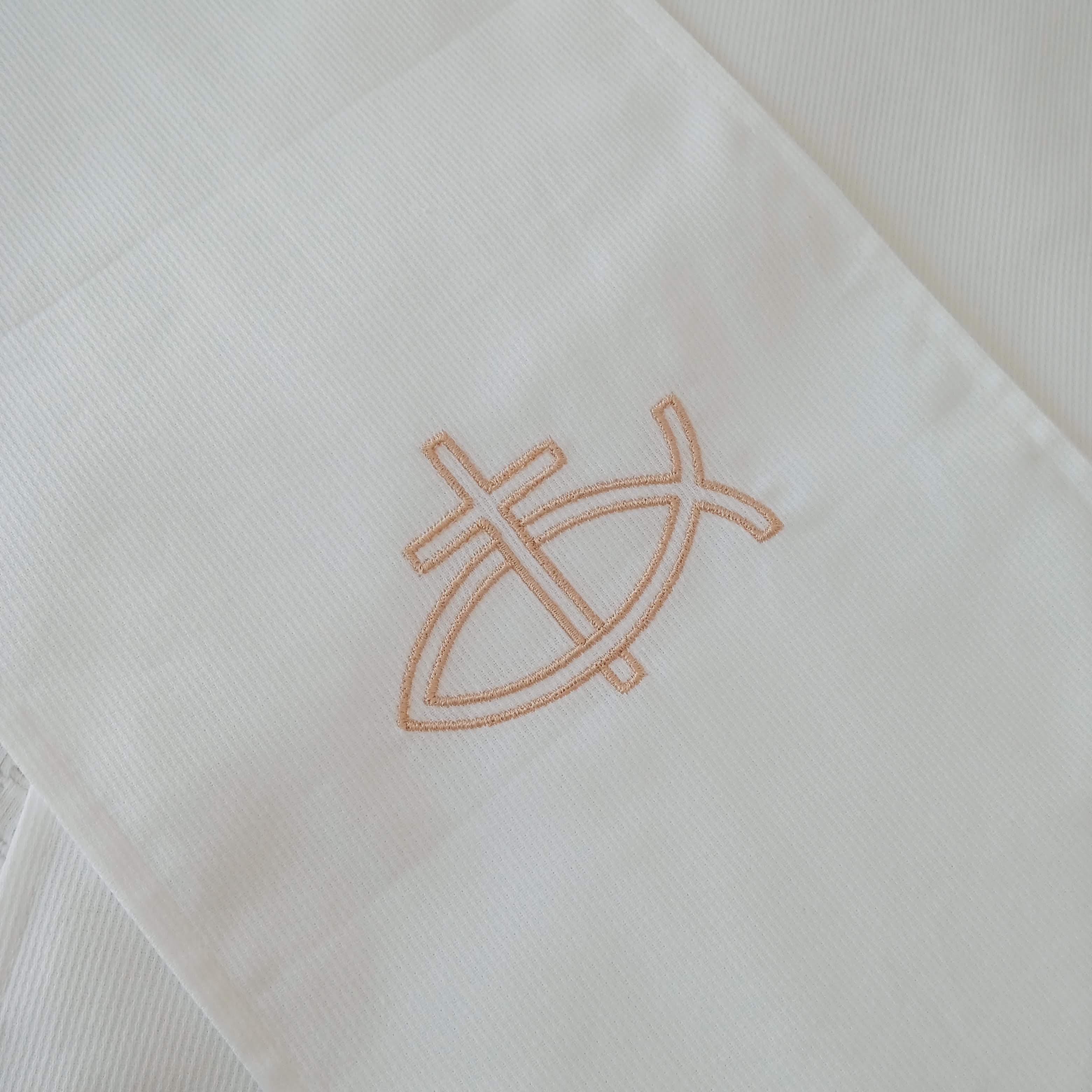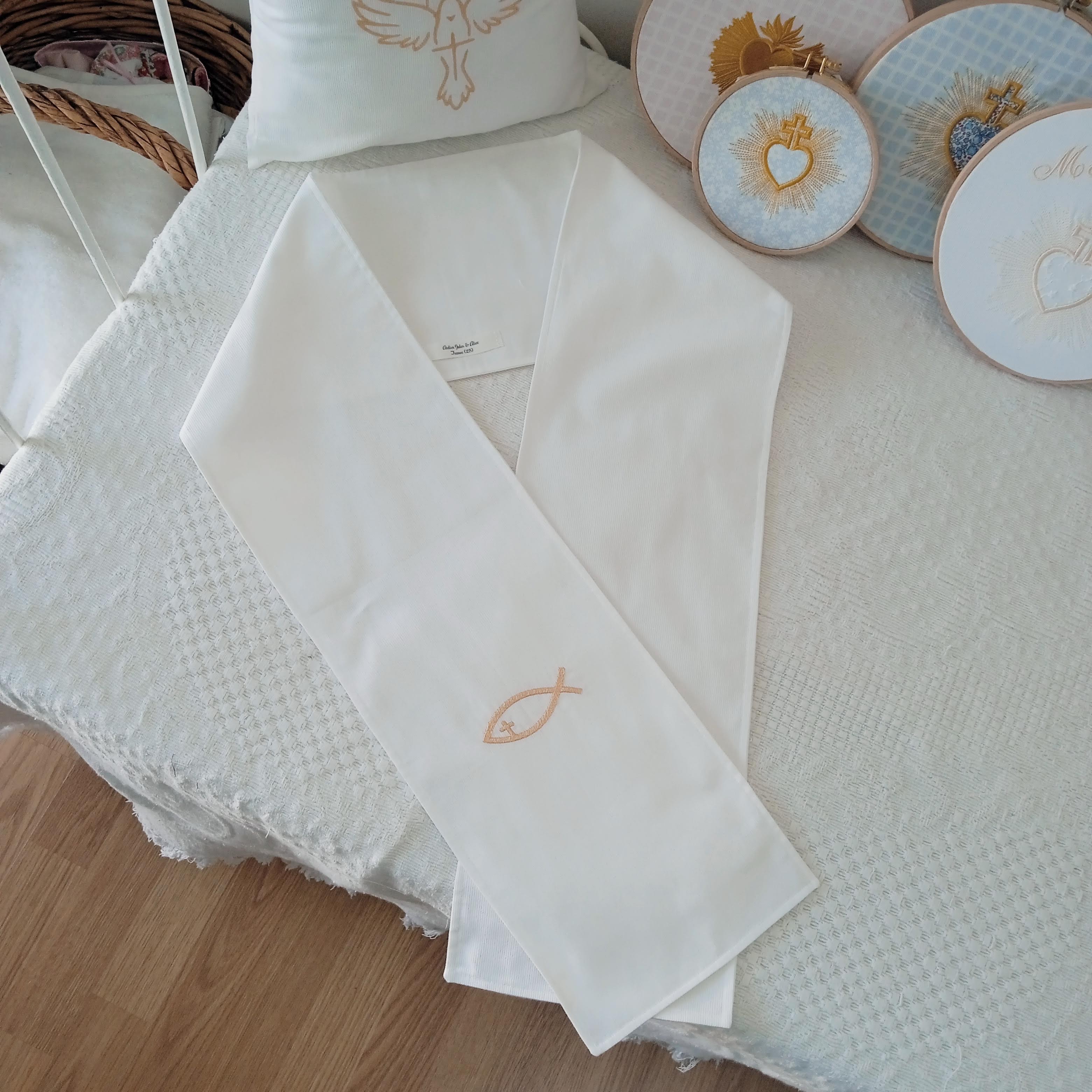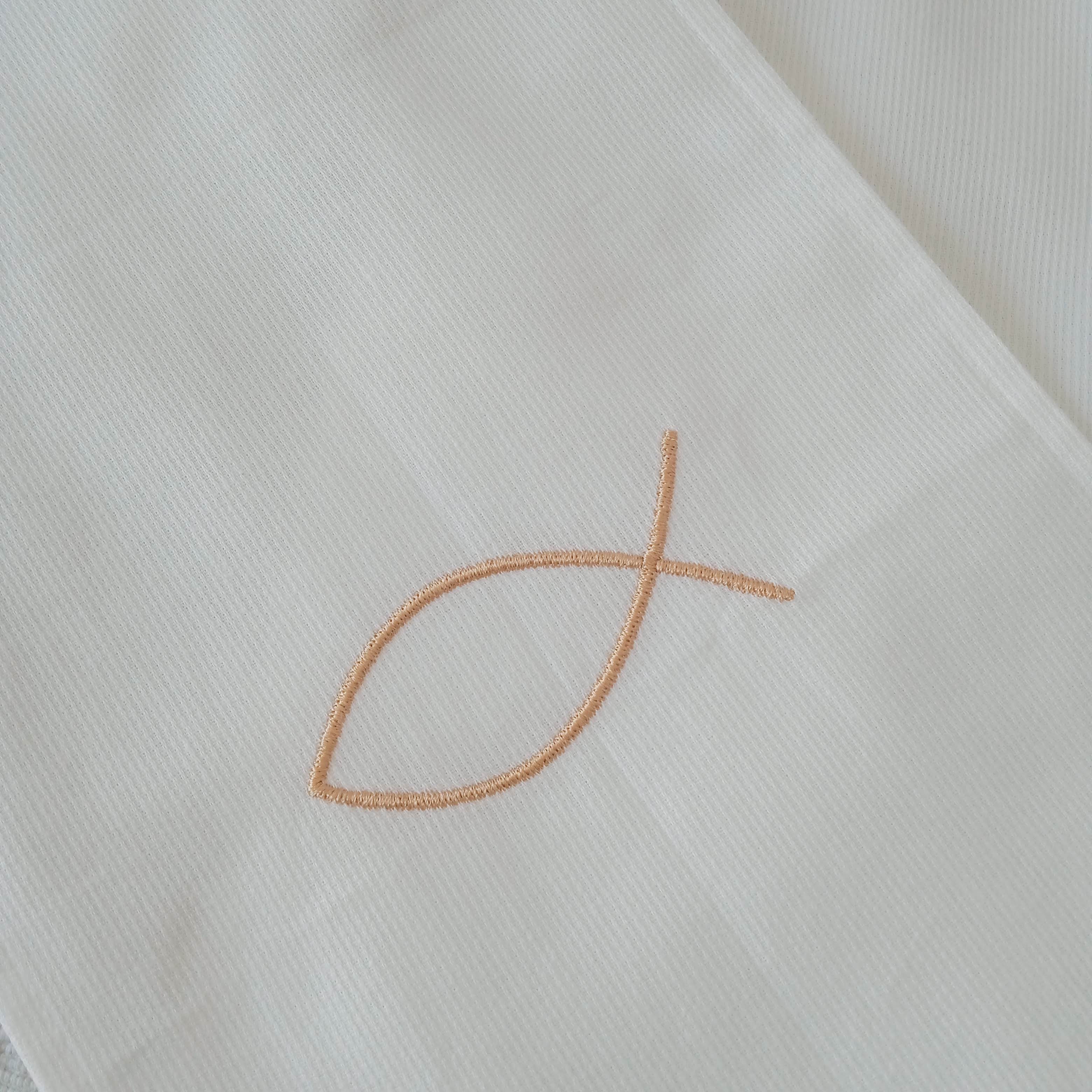 Ces écharpes de baptême religieuses sont ornées d’une broderie fine d'un ICHTHUS tout simple, dans un style très épuré. Ce symbole est particulièrement adapté pour les baptêmes d'adolescents et d'adultes, car très simple et discret. Brodé en blanc, ce symbole apporte à l’écharpe une dimension spirituelle délicate et raffinée, parfaite pour un souvenir de baptême personnalisé.
