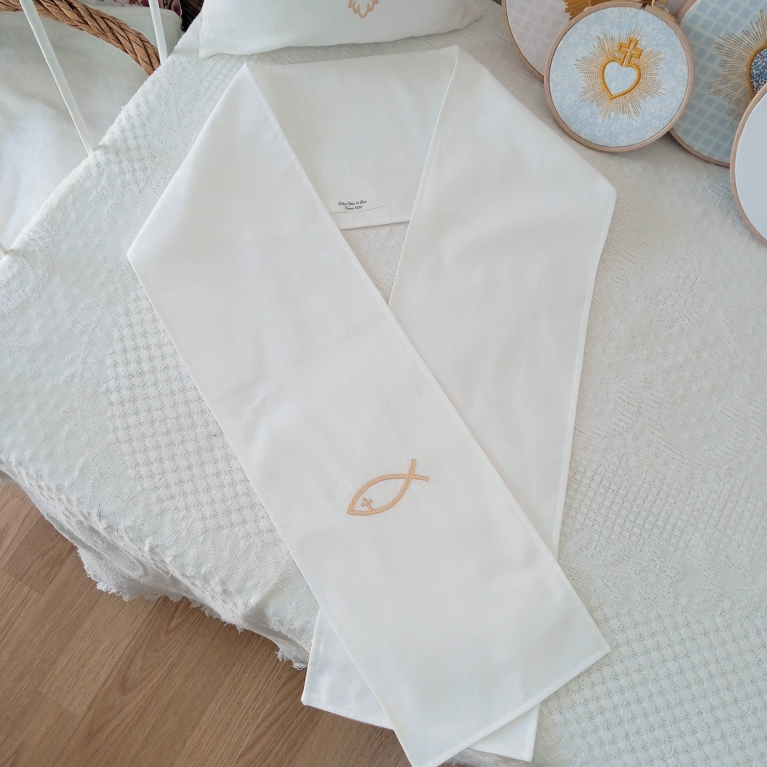 écharpe de baptême adulte / adolescent blanche, brodée d'un ICHTHUS très épuré.