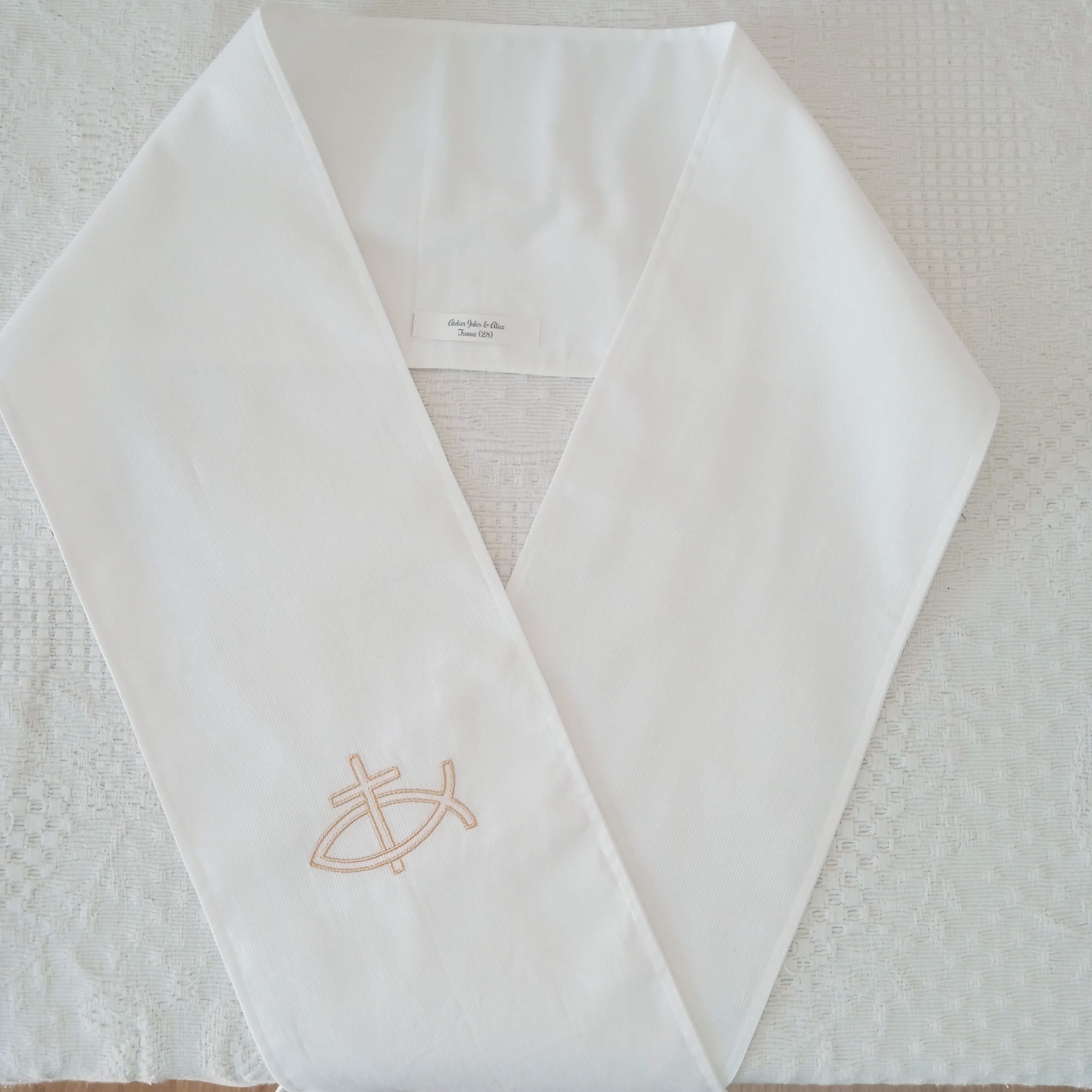 écharpe de baptême adulte / adolescent blanche, brodée d'un ICHTHUS très épuré.