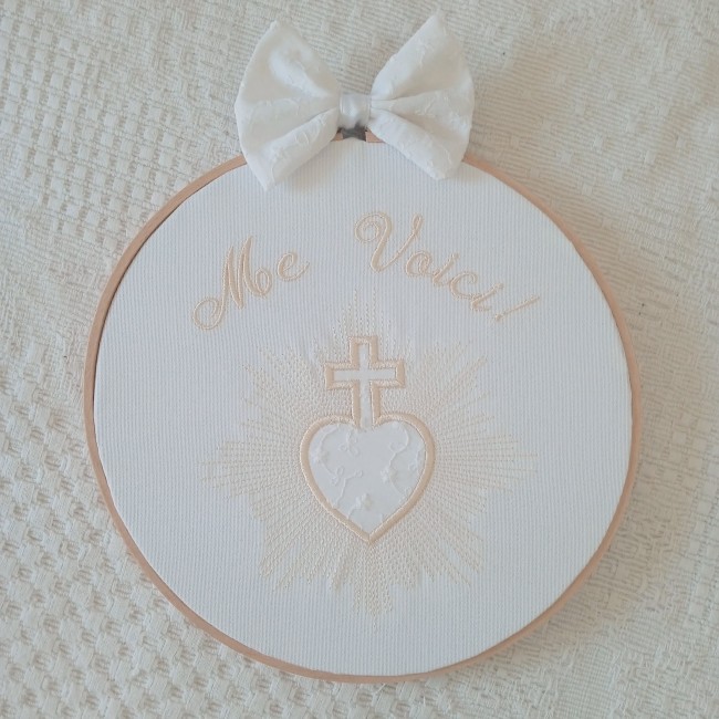Ce tambour brodé représentant le Sacré-Cœur surmonté d’une croix est une création artisanale empreinte de lumière et de spiritualité. Délicatement brodé de fils écrus, il évoque la puissance de l’amour du Christ et la profondeur de la Foi chrétienne.