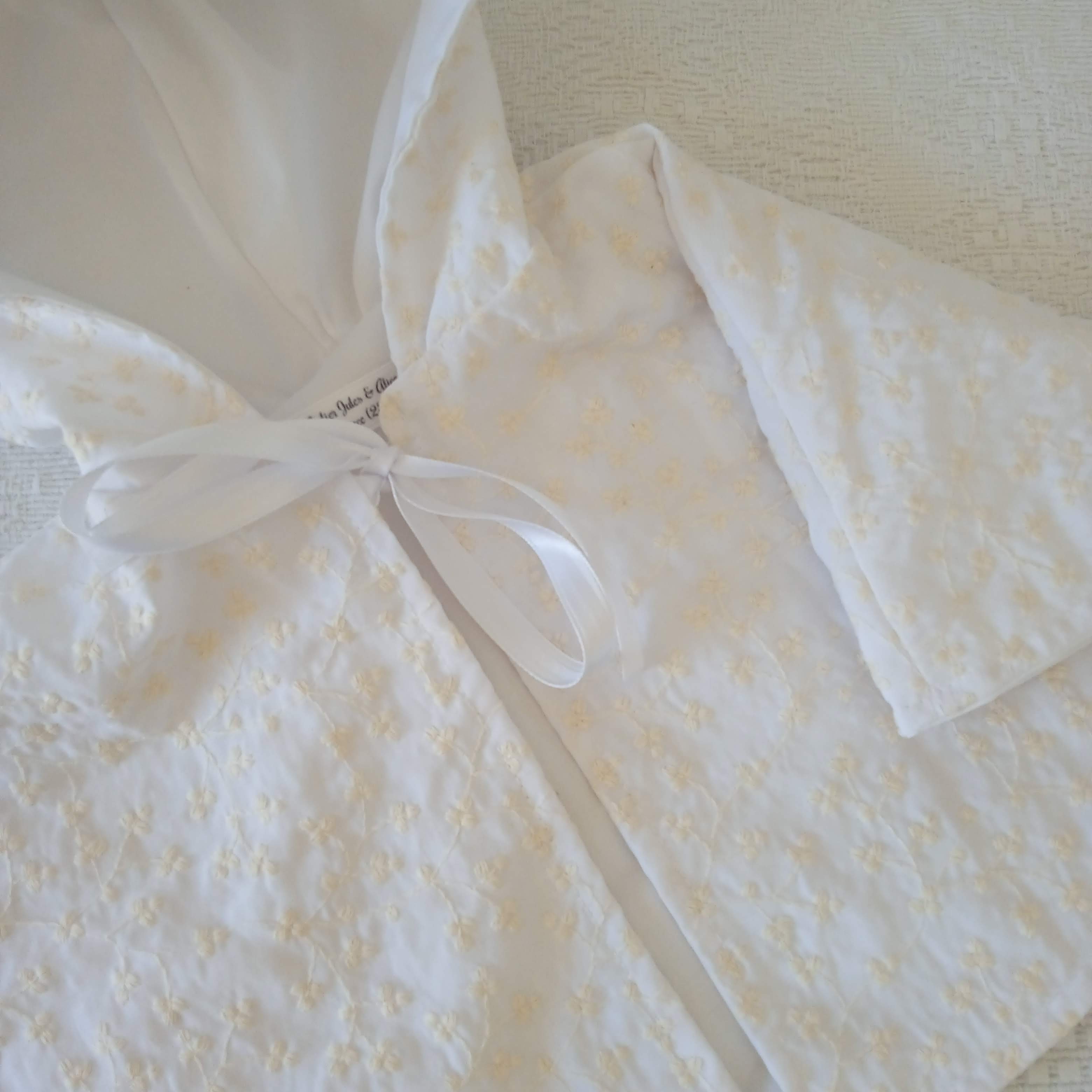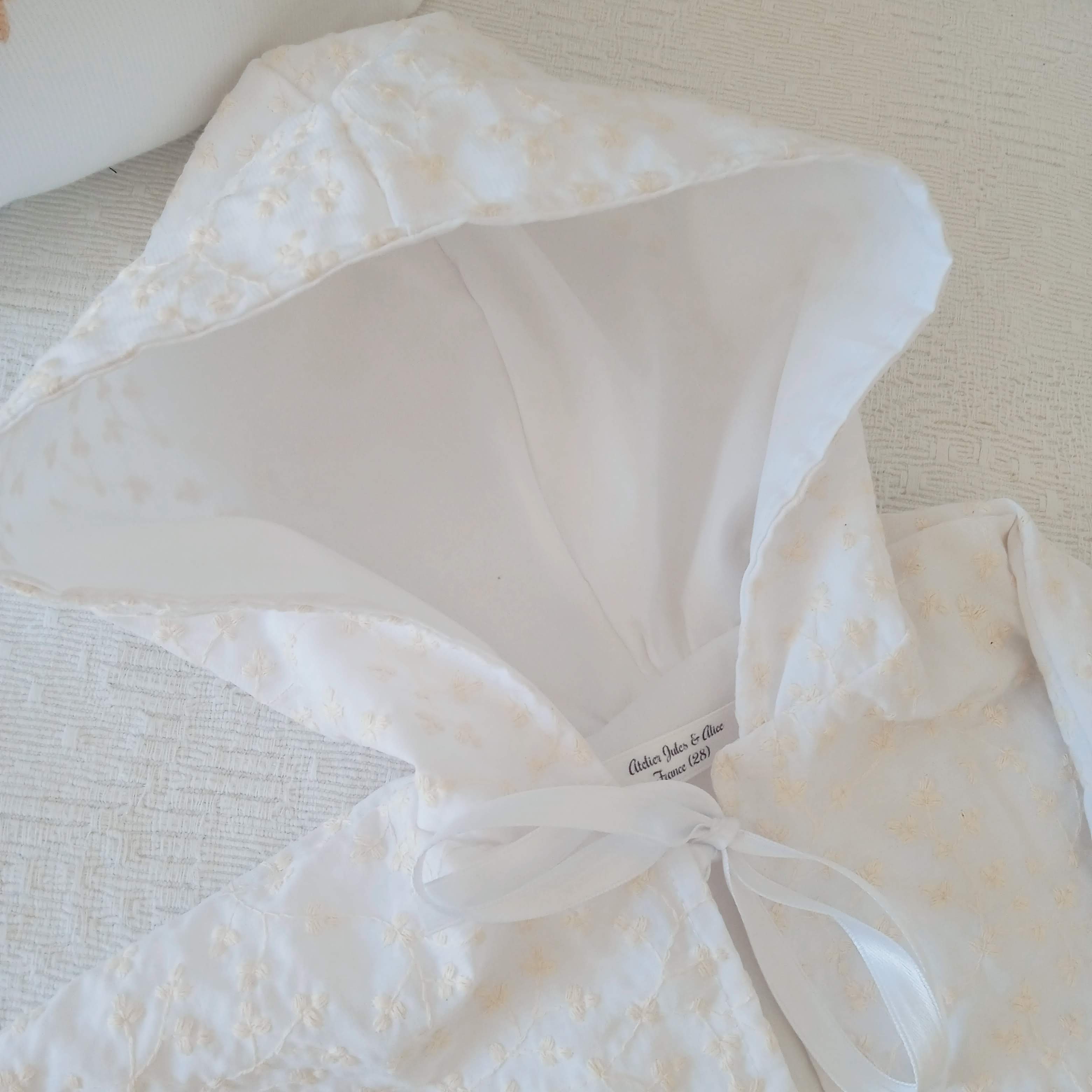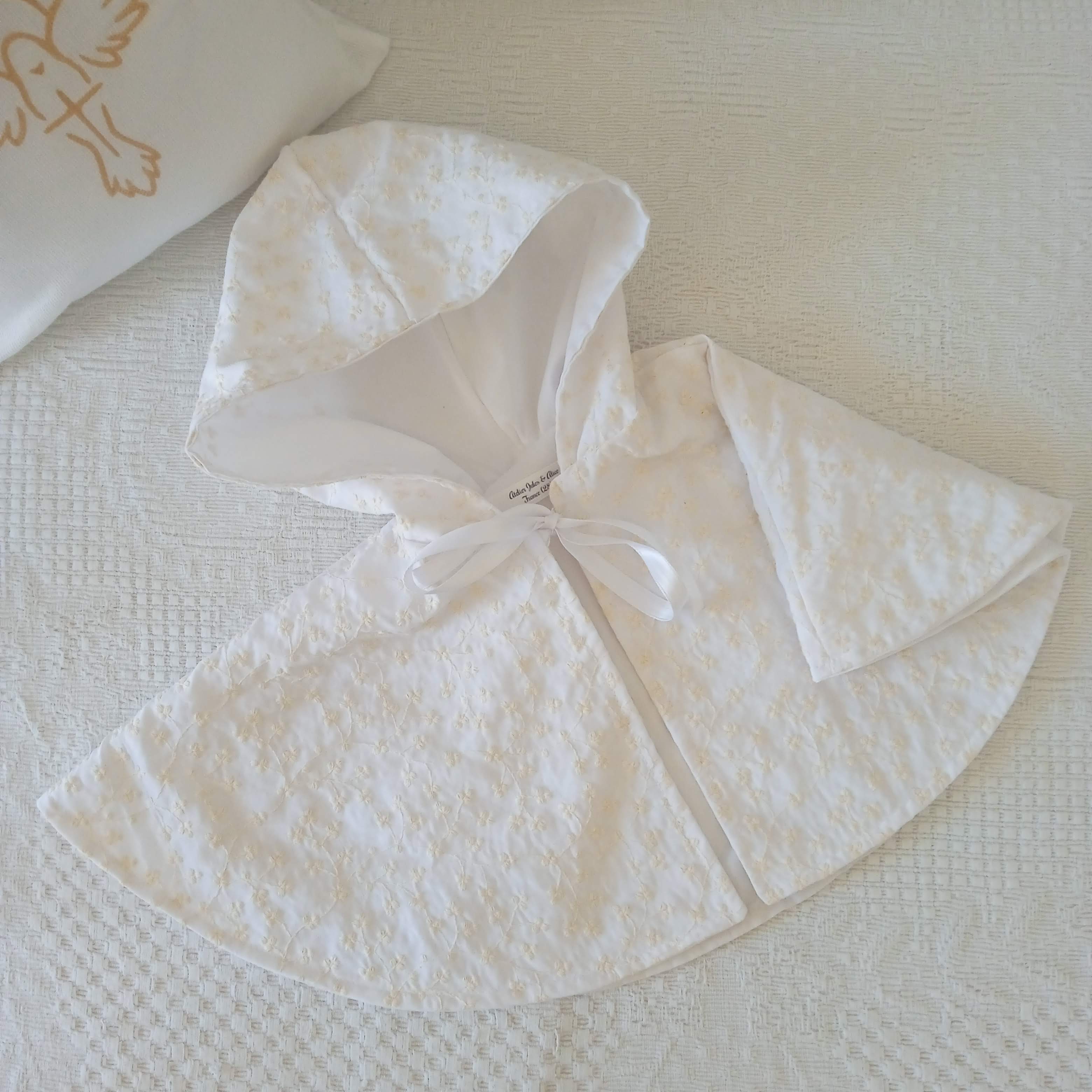 Cape de baptême avec capuche en tissu brodé fleurettes ivoires.