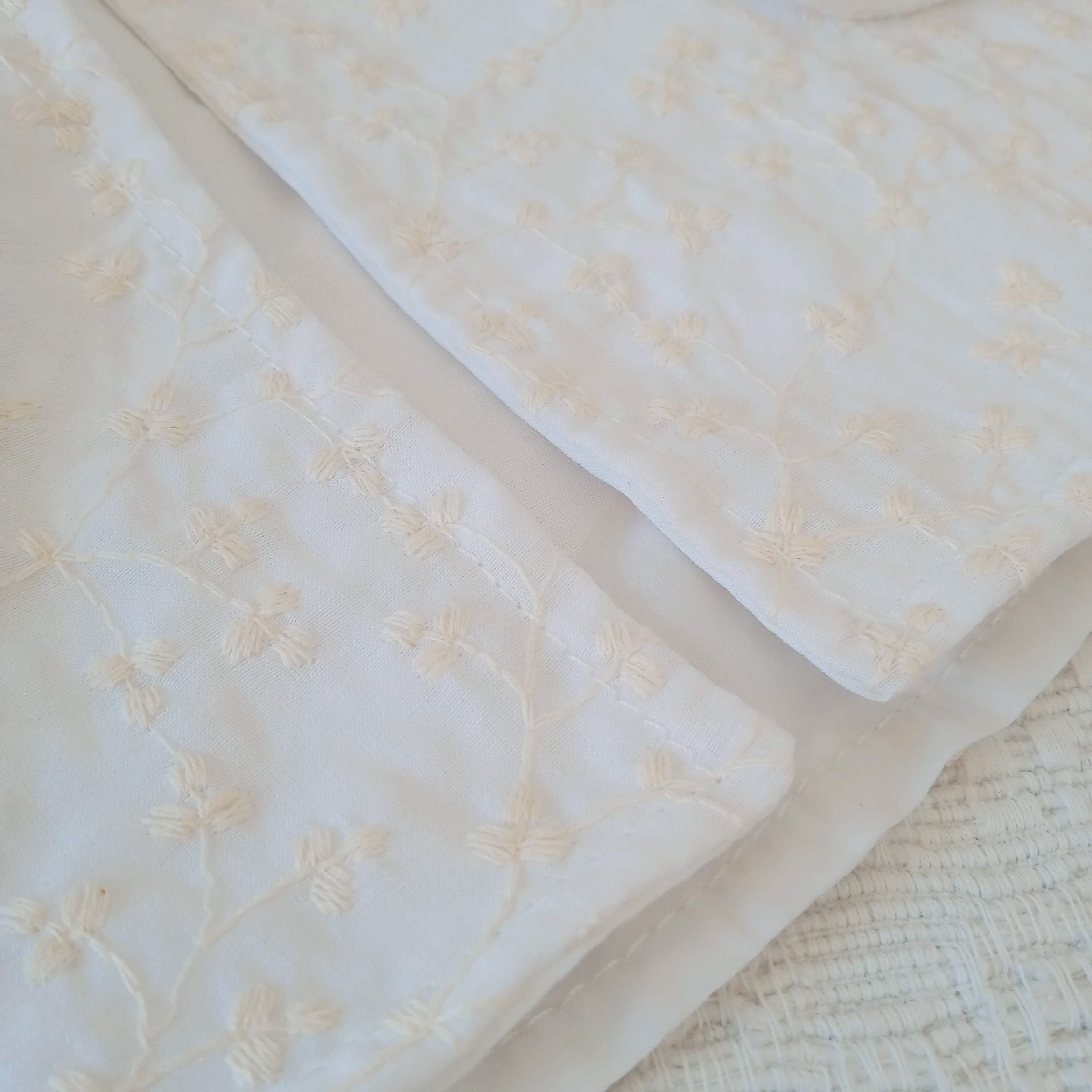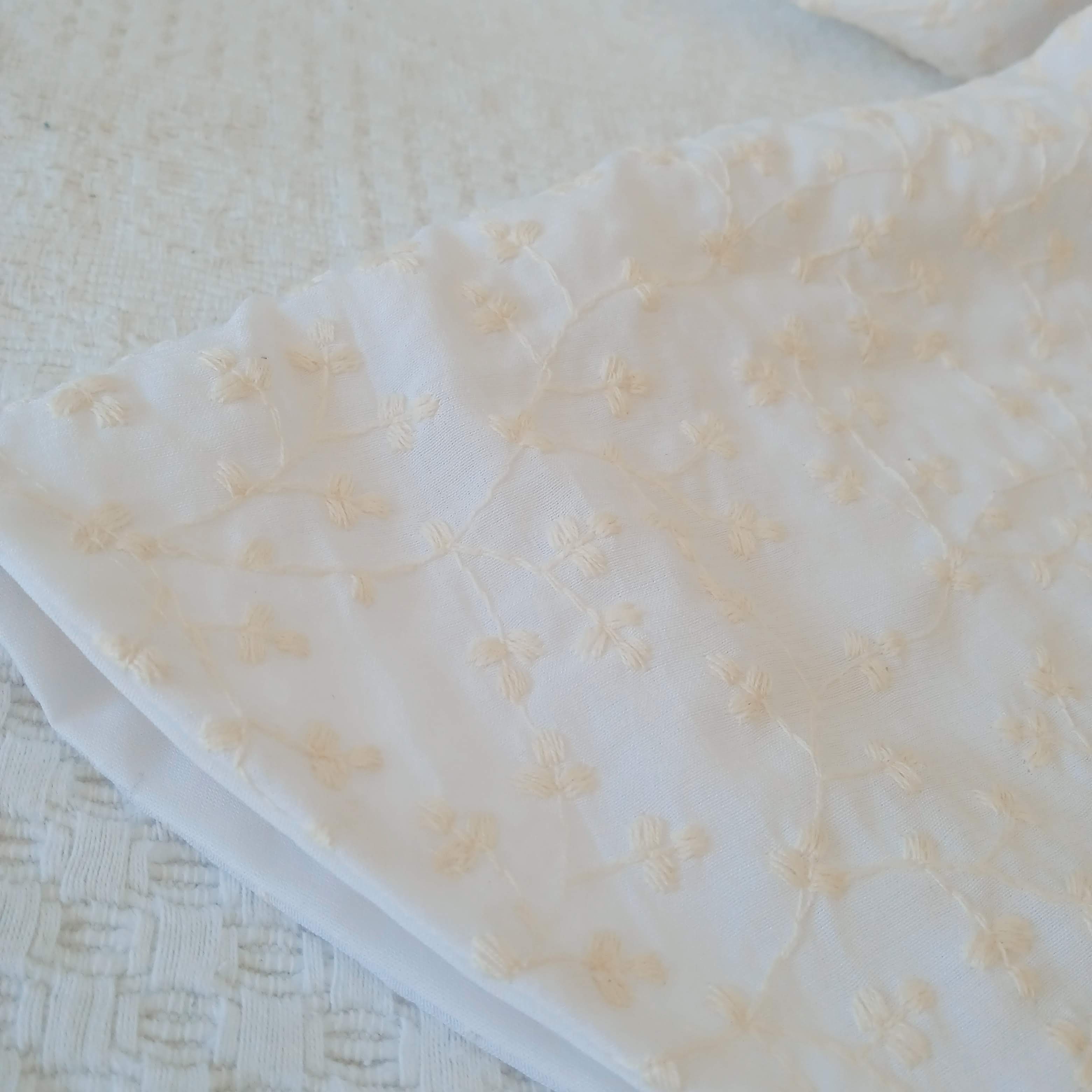 Extérieur en tissu blanc délicatement brodé de fleurettes ivoires (tissu 55% viscose et 45% Polyester, broderie en coton)