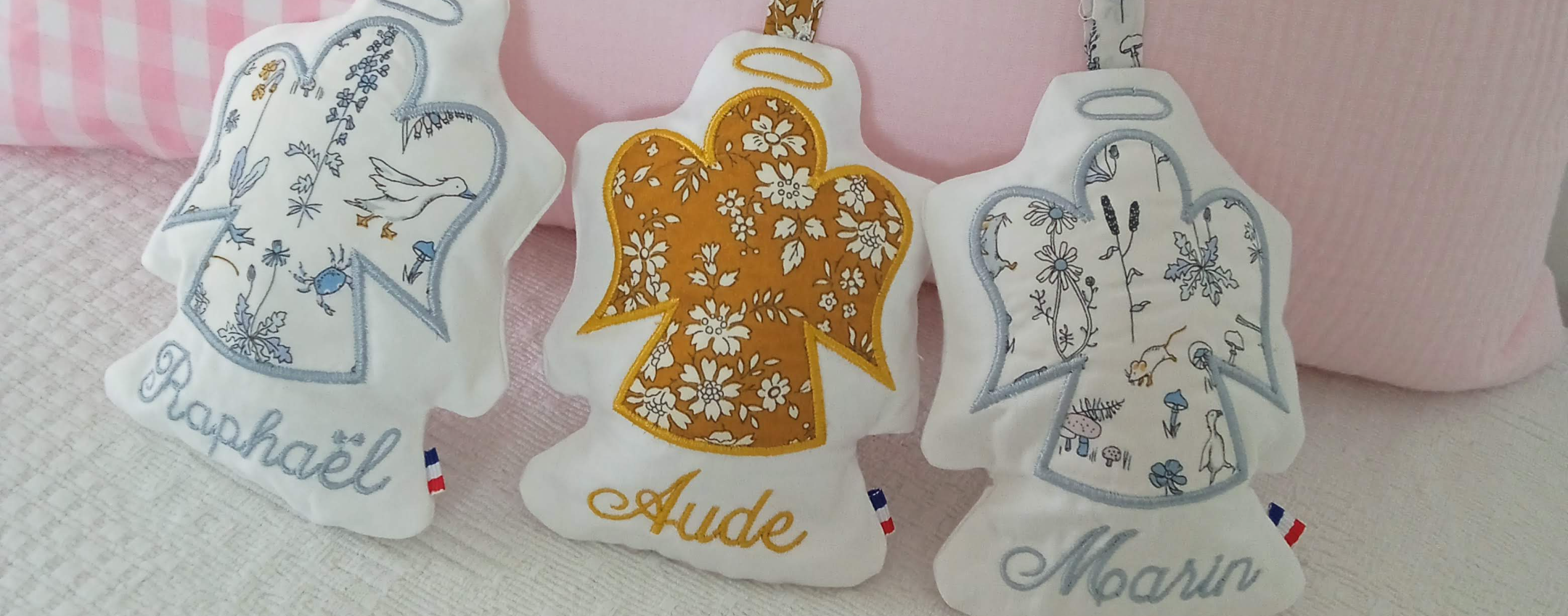 Un joli petit ange, une croix ornementale ou encore une colombe de la paix à personnaliser avec la broderie d'un prénom et le tissu de votre choix.