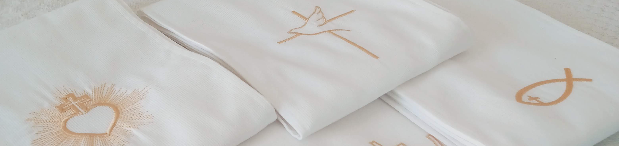 Vous retrouverez quelques exemplaires d'écharpe de baptême ado ou adulte, des capes de baptême bébé, ainsi que des tambour à offrir avec une broderie d'un symbole religieux.